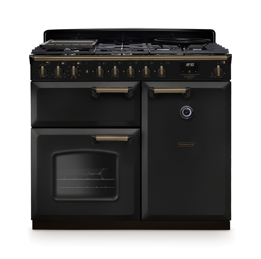 Classic Deluxe 100cm Dual Fuel Range Cooker – Charcoal Black with Antique Brass Trim