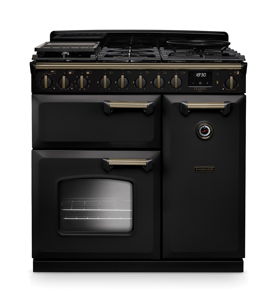 Classic Deluxe 90cm Dual Fuel Range Cooker – Charcoal Black with Antique Brass Trim