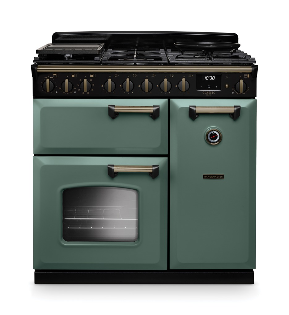 Classic Deluxe 90cm Dual Fuel Range Cooker – Mineral Green with Antique Brass Trim