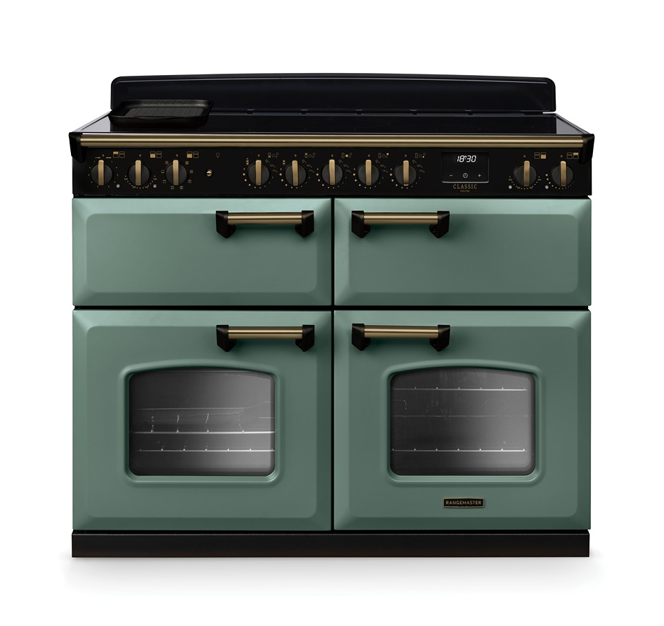 Classic Deluxe 110cm Induction Range Cooker (Slow Oven) – Mineral Green with Antique Brass Trim